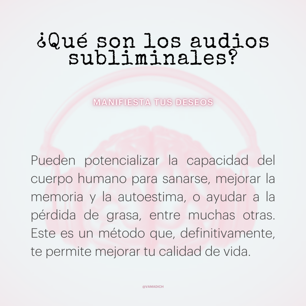 Obtendrás un pequeño manual de uso en formato .pdf incluyendo las afirmaciones secretas contenidas en tu audio subliminal y una pista de audio en formato .mp3 que puedes agregar a tu reproductor favorito y comenzar a hackear la matrix comenzando por tu subconsciente.